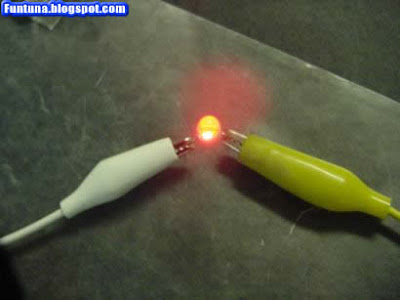 In the above image, electrons flow from the "-" (nail) end of our lemon battery through the LED (making it glow) then back to the "+" (penny) end of the battery. This is an electronic circuit. The LED glows dimly with this configuration.